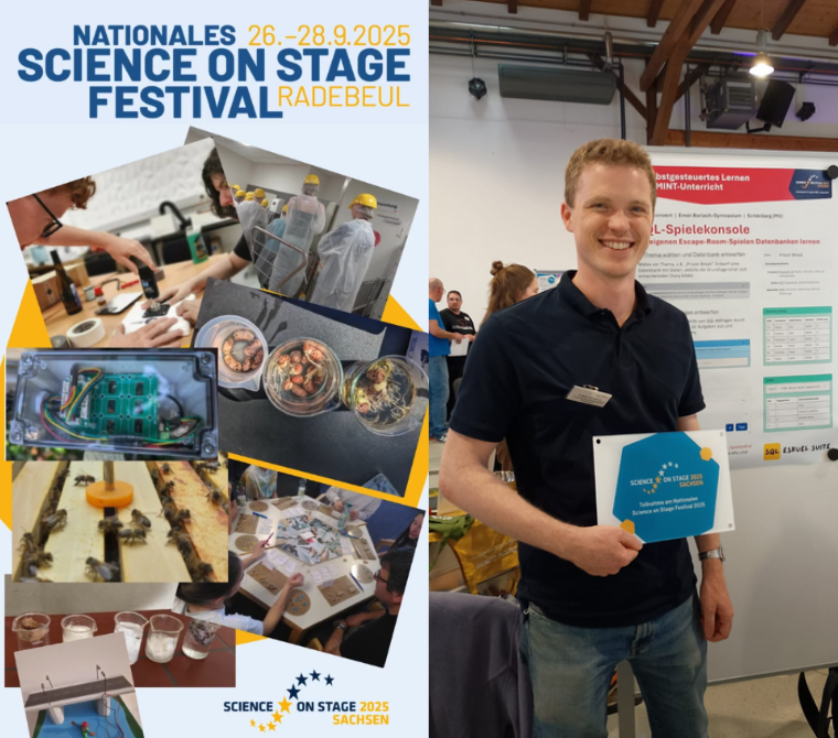 Vom 26.-28.09.2025 fand das Nationale Science on Stage Festival in Radebeul statt. 50 ausgewählte Unterrichtsprojekte wurden im Rahmen einer Messe und durch Kurzpräsentationen vorgestellt. Mit dabei war auch das Projekt „SQL-Spielekonsole − Datenbanken lernen durch eigene Escape-Room-Spiele“, eingereicht von L. Convent. Das Projekt ermöglicht Schülerinnen und Schülern, ihre eigenen Escape-Room-Spiele zu entwerfen: Heraus kommen spielbare Endprodukte, die den Umgang mit Datenbanken auf spielerische Weise nahebringen. Eine Auswahl einiger sehr gelungener Spiele, entwickelt von der EBG-Schülerschaft, sind auf der Projekt-Website hinterlegt.
