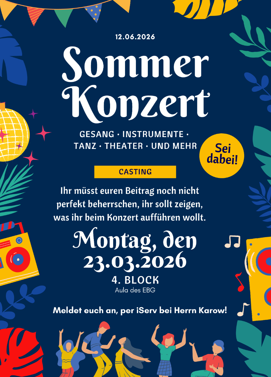 Am 12. Juni findet wieder ein Sommerkonzert statt. Gesangs-, Instrumental-, Tanz-, Theater- und weitere Talente sind gesucht und herzlich eingeladen zum Casting am Montag, 23.03.2026 im 4. Block in der Aula. Bitte per IServ bei Herrn Karow anmelden. Wir freuen uns auf euch!